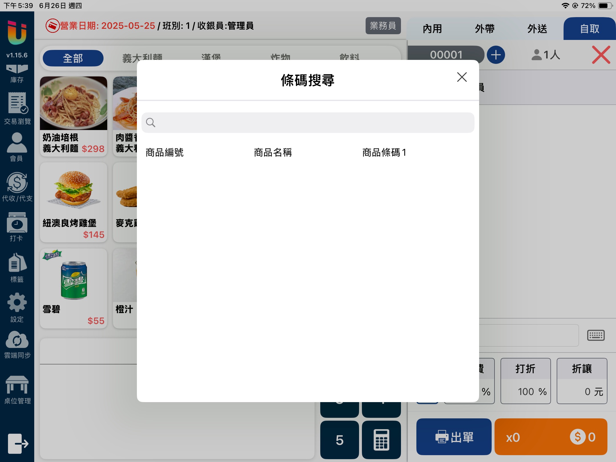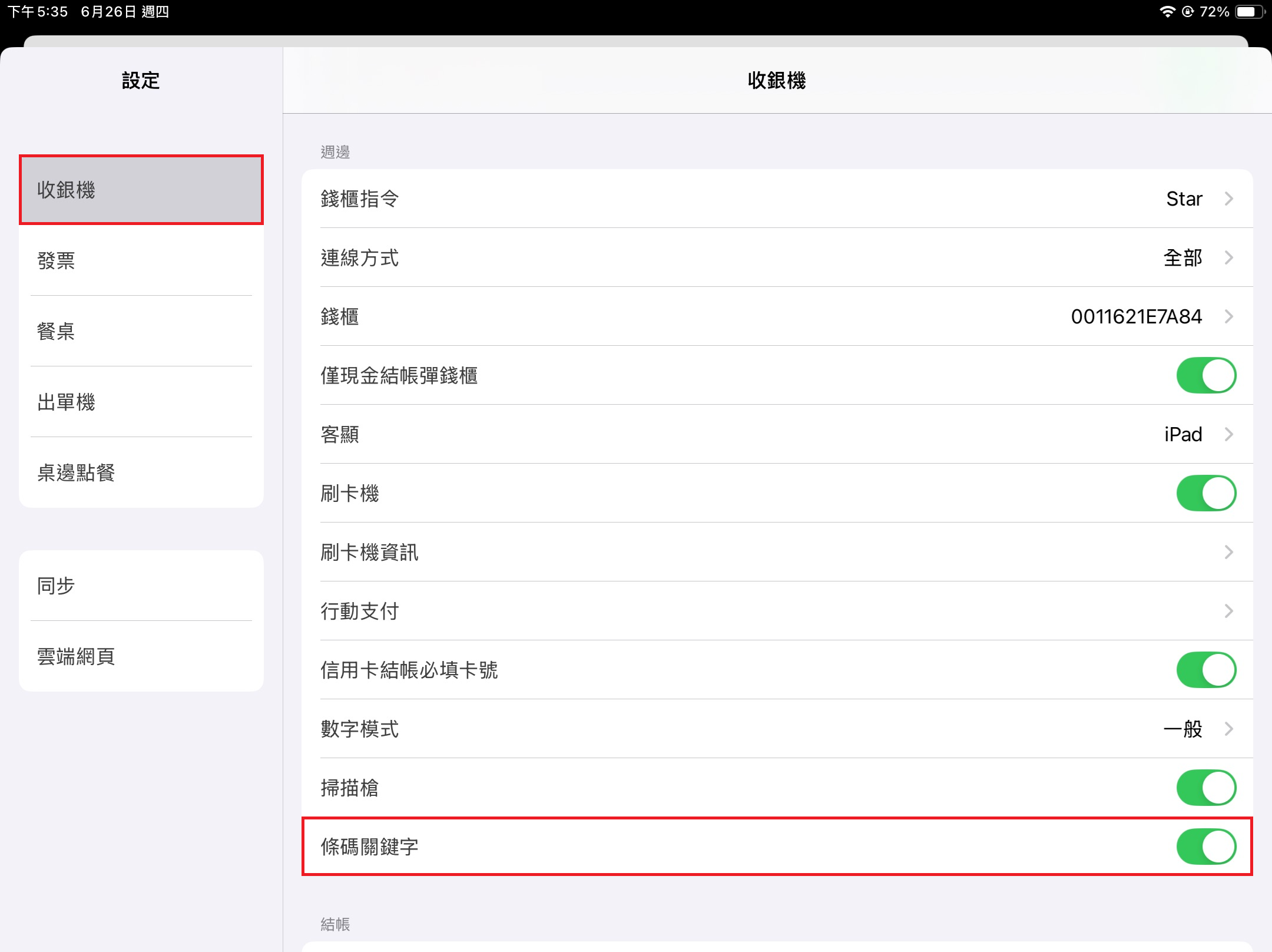 於左方 [功能表] 點選 [設定],點擊該頁面 [收銀機] > [周邊] > [條碼關鍵字] 打開開關,即可在搜尋時進行 [關鍵字搜尋],如關閉該開關則為 [精準搜尋]。