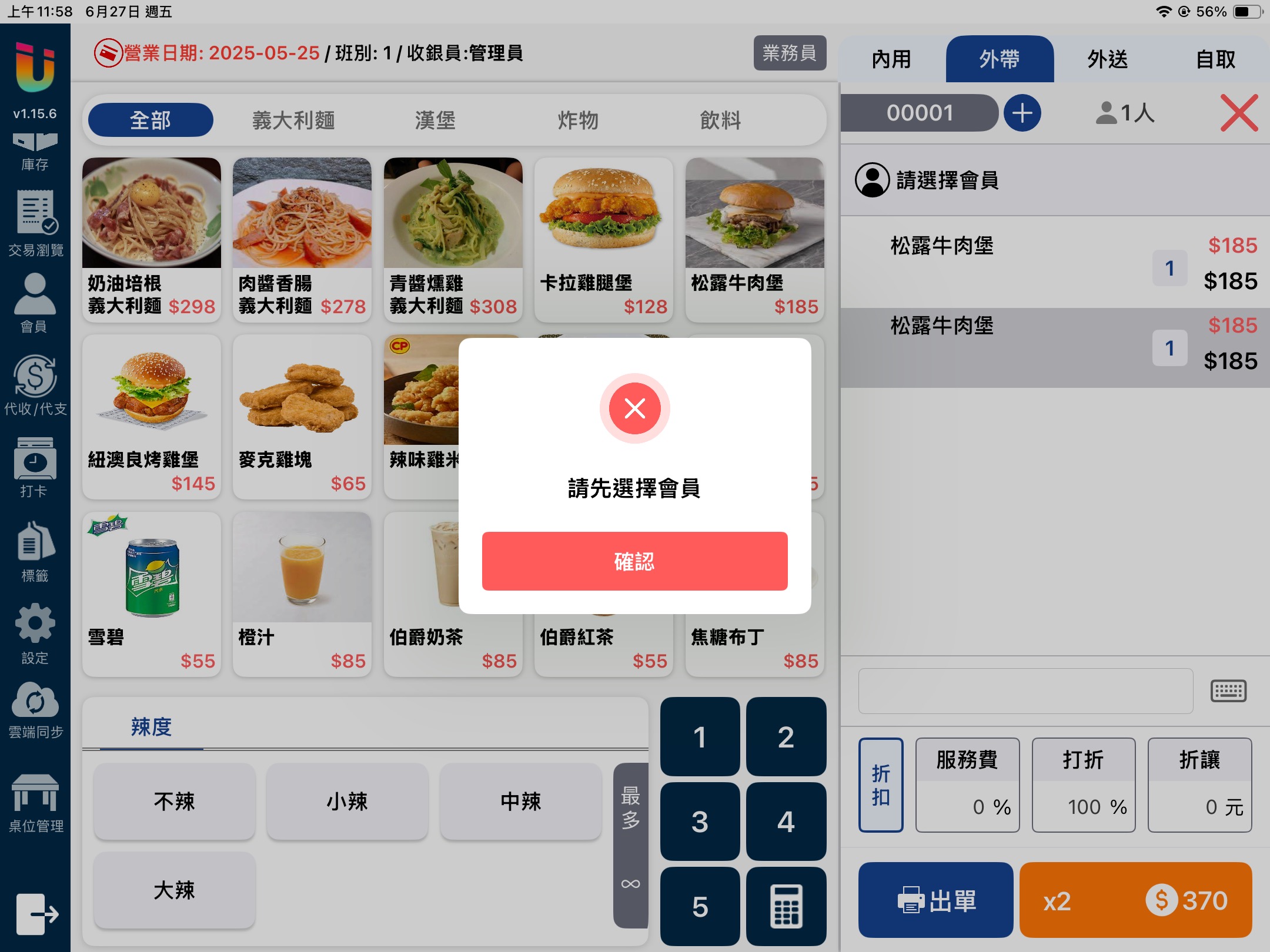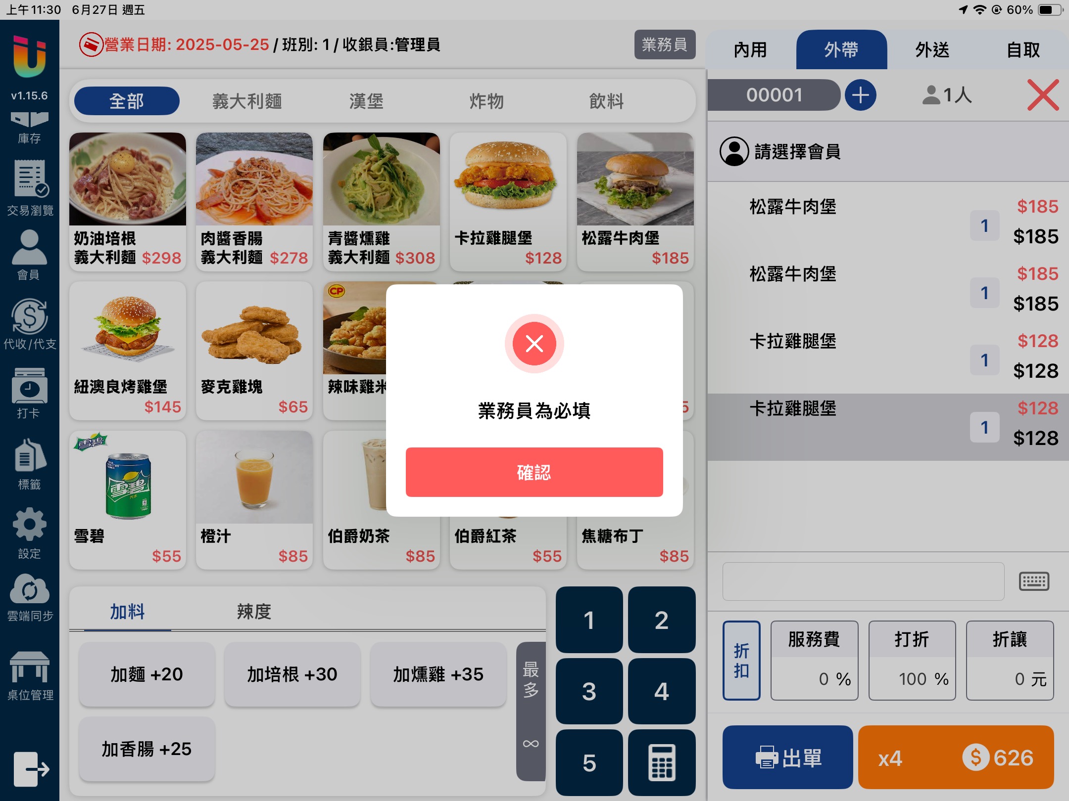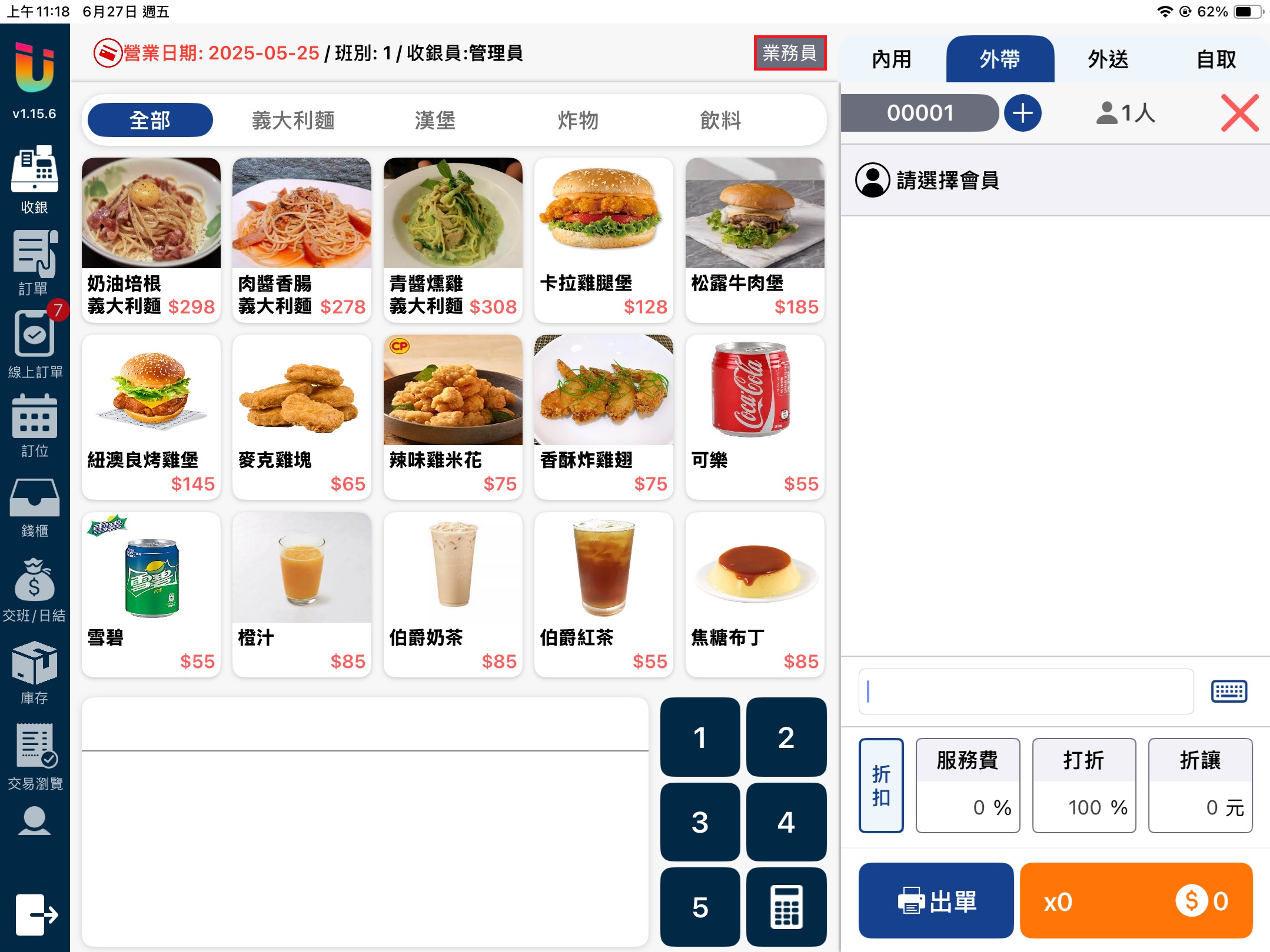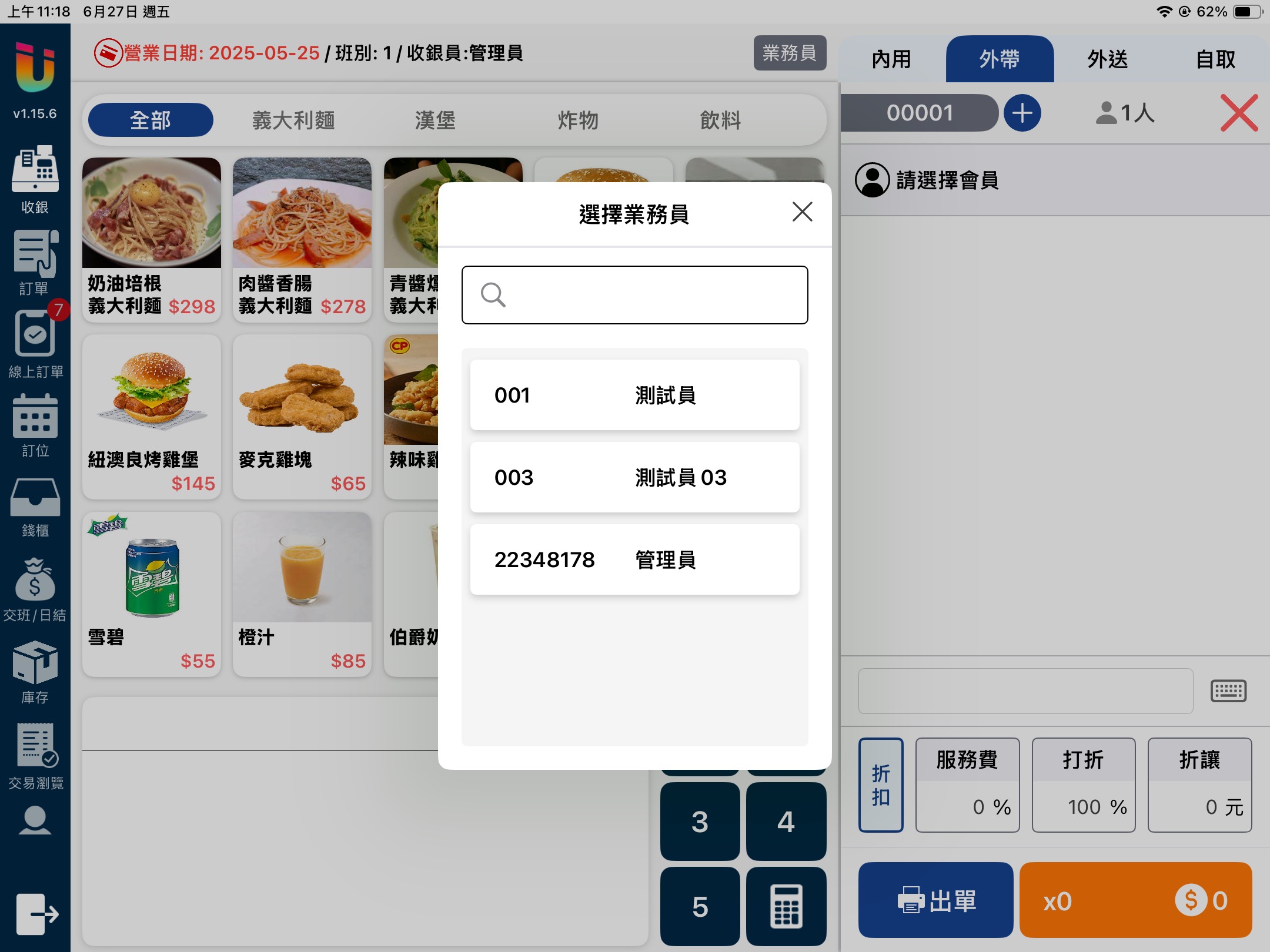 當該功能開啟時於 [點餐介面] 點擊上方的 [業務員] 按鈕,即可選擇該筆單據的業務員並記錄業績。
