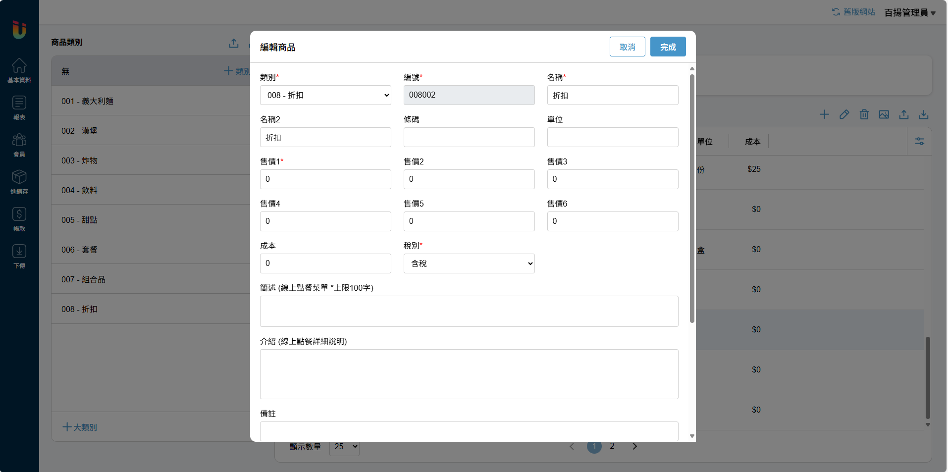 舉例: 如在搜尋框輸入 [01] 則搜尋結果會顯示所有商品編號或商品條碼字段含 [01] 的商品,例商品編號301225