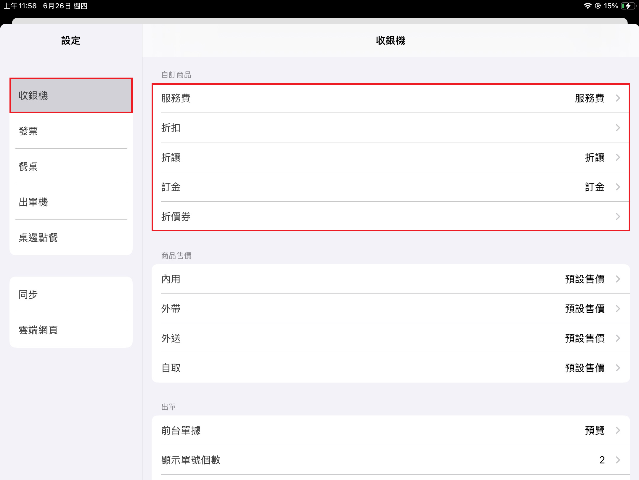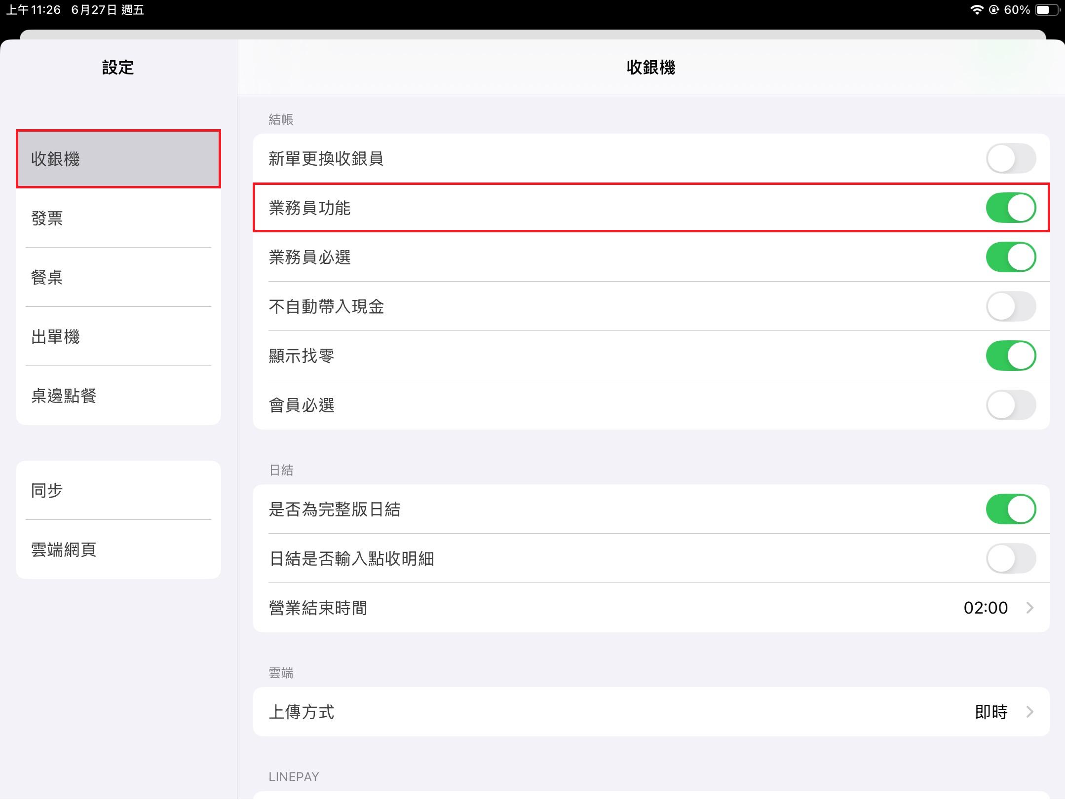 前台Pos 左方 [功能表] 點選 [設定],點擊該頁面 [收銀機] > [結帳] > [業務員功能] 即可開啟業務員功能。