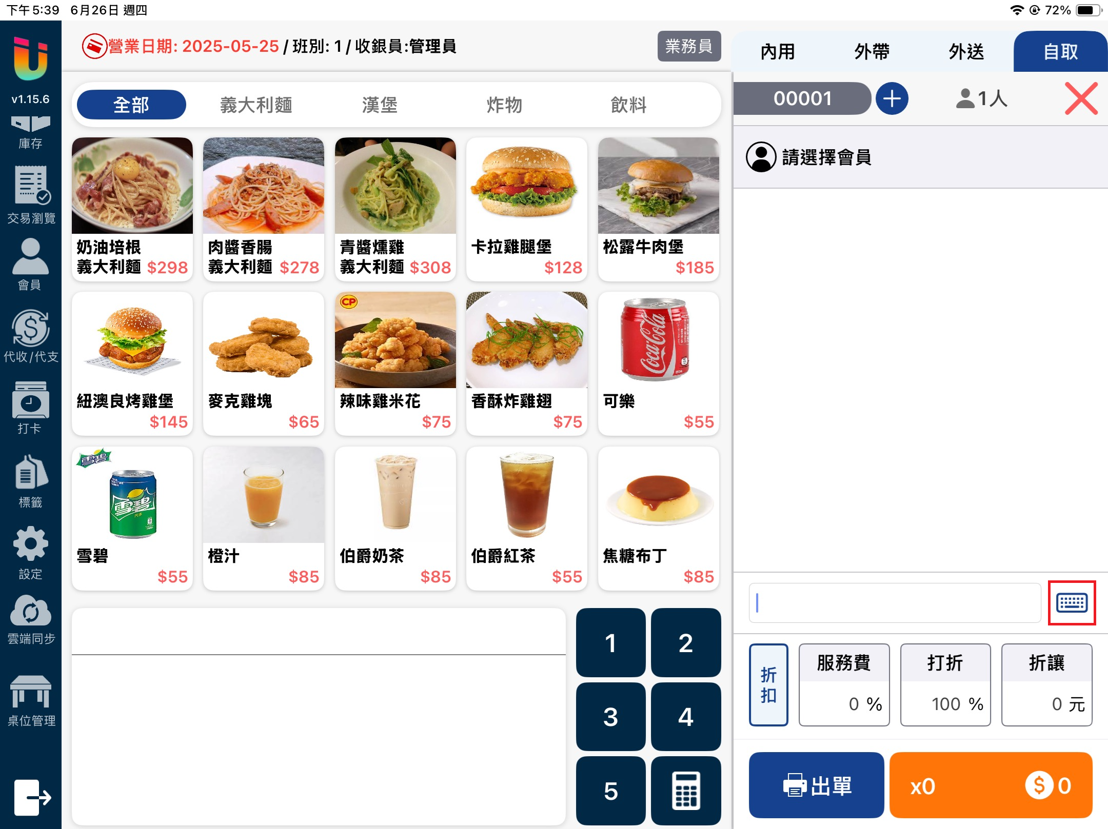 該功能開啟後,於 [點餐介面] 使用掃描槍直接掃描條碼即可帶入商品,如需要查詢商品也可以點擊 [點餐介面] 右下方的 [鍵盤] 按鈕於彈窗輸入 [商品編號] 或 [商品條碼] 來搜尋商品。