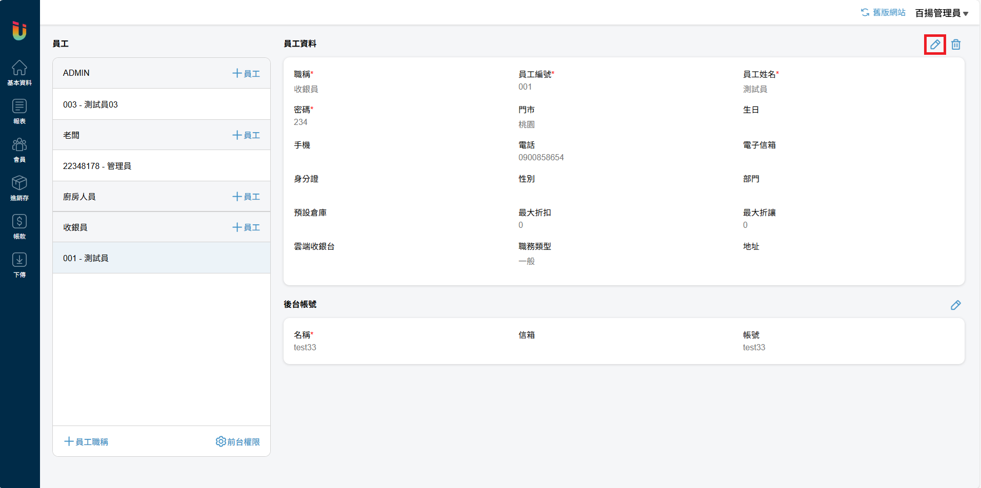 於 [雲端後台] > [基本資料] > [員工與權限] 選擇欲設定為業務員的員工,點擊 [編輯] 按鈕並於 [職務類型] 欄位選擇業務員,即可將員工設為業務員。