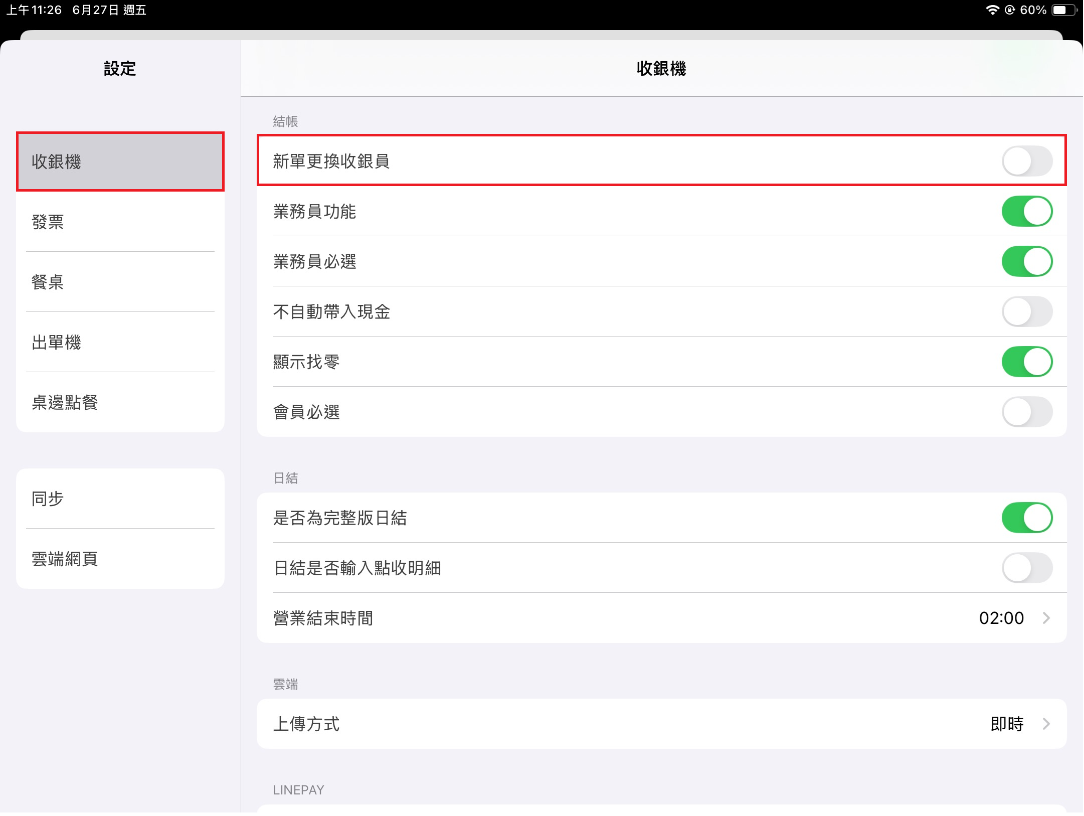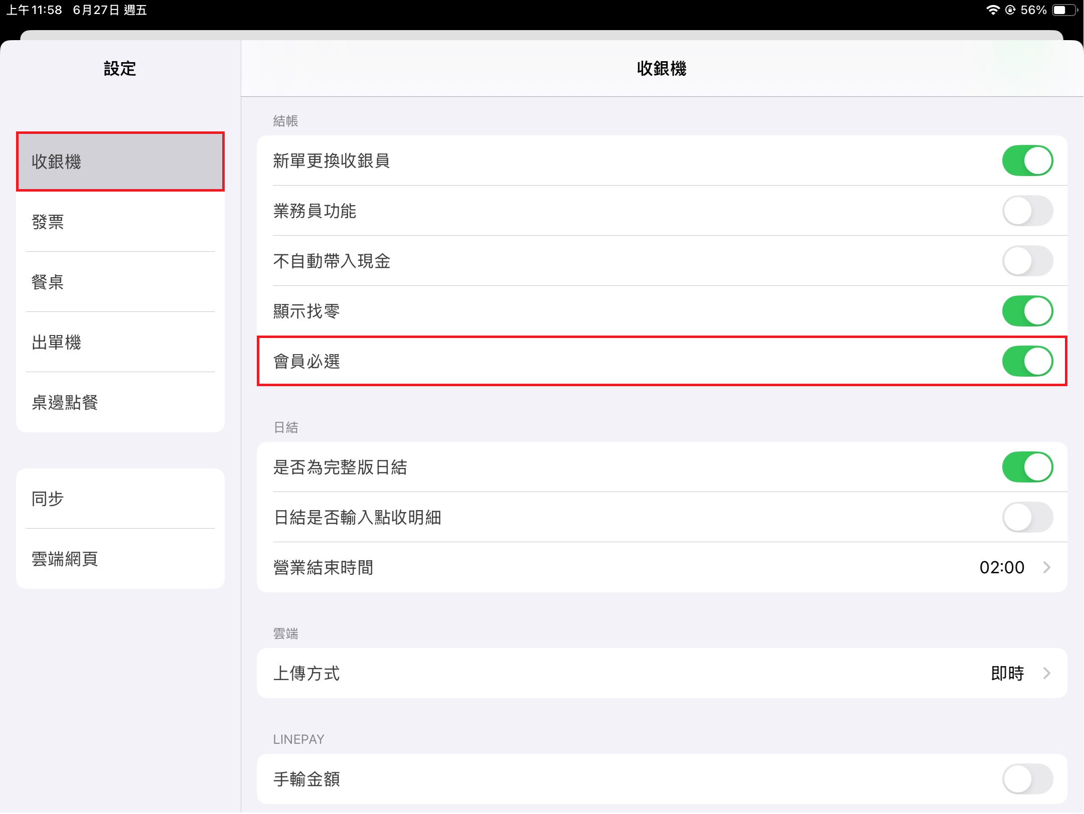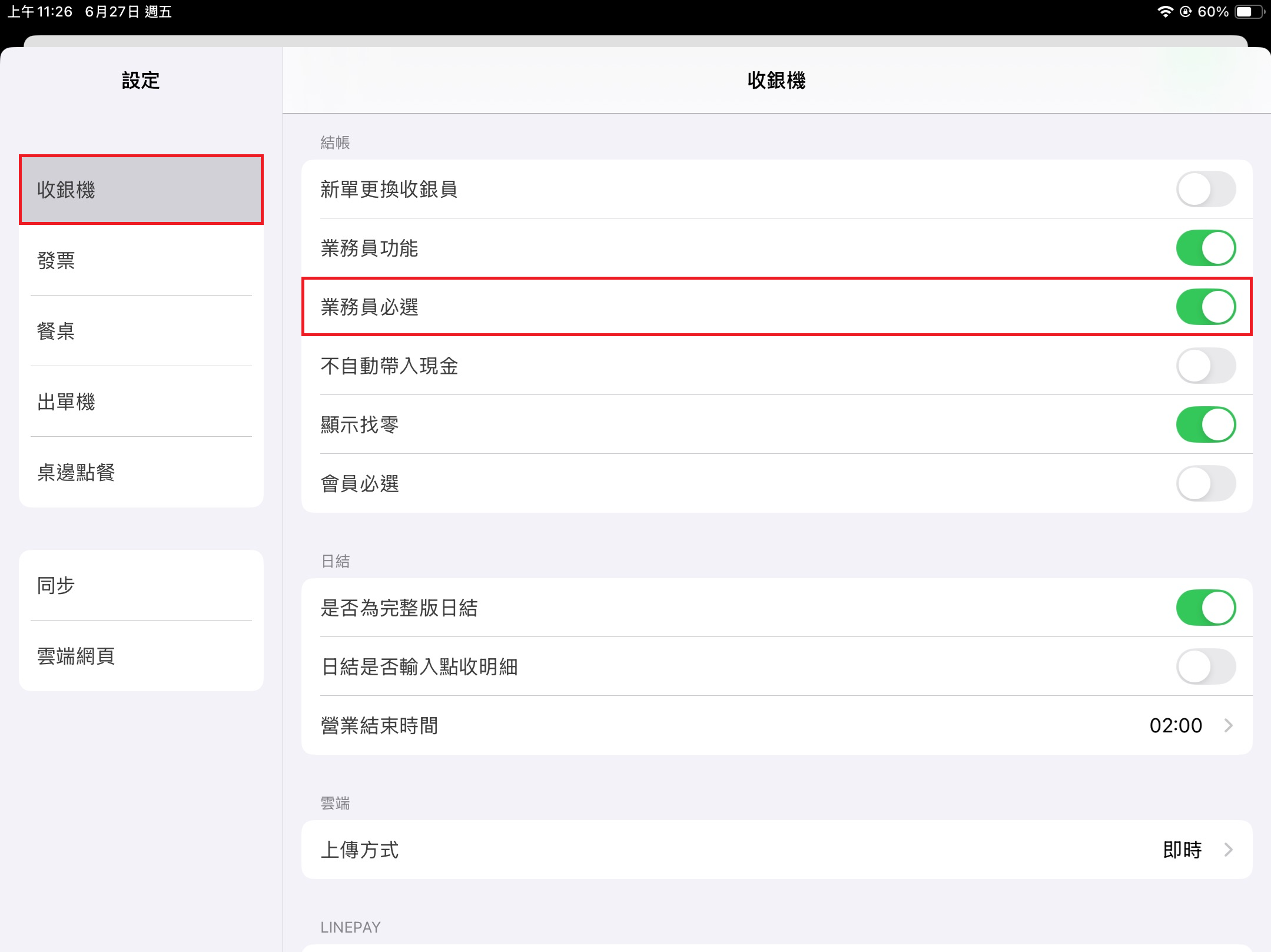 當 [業務員功能] 開啟時,於左方 [功能表] 點選 [設定],點擊該頁面 [收銀機] > [結帳] > [業務員必選],可以要求每筆單據一定要選擇業務員才能進行結帳。
