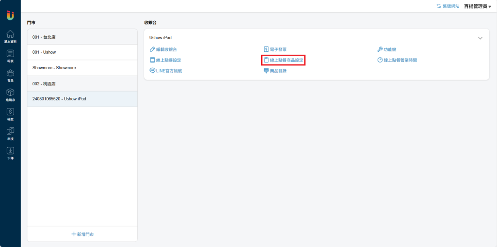 於雲端後台左方列表點選 [基本資料] > [門市與收銀台],進入該頁面後點選欲設定的 [收銀台] 並點擊 [線上點餐商品設定] 按鈕進入頁面即可設定線上點餐菜單上有哪些商品。