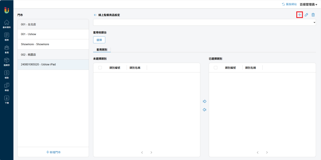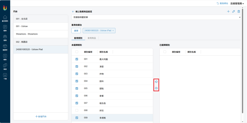 將商品或類別從左邊 [未選擇] 區移至右邊 [已選擇] 區即可加入菜單。