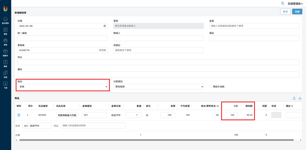 舉例: 小記為100元,單據稅別為含稅,則應稅額為100/1.05=95.24元