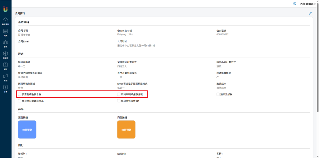 [基本資料] > [公司資料] > [發票明細金額含稅] 和 [銷貨單明細金額含稅] 可以設定列印出來的 [銷貨單] 與 [發票] 的明細金額是否為含稅額。