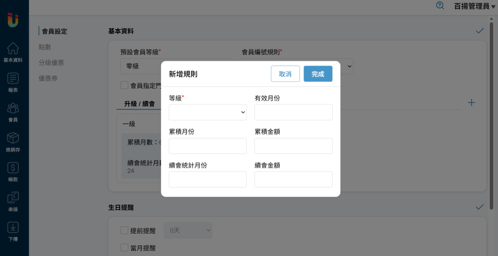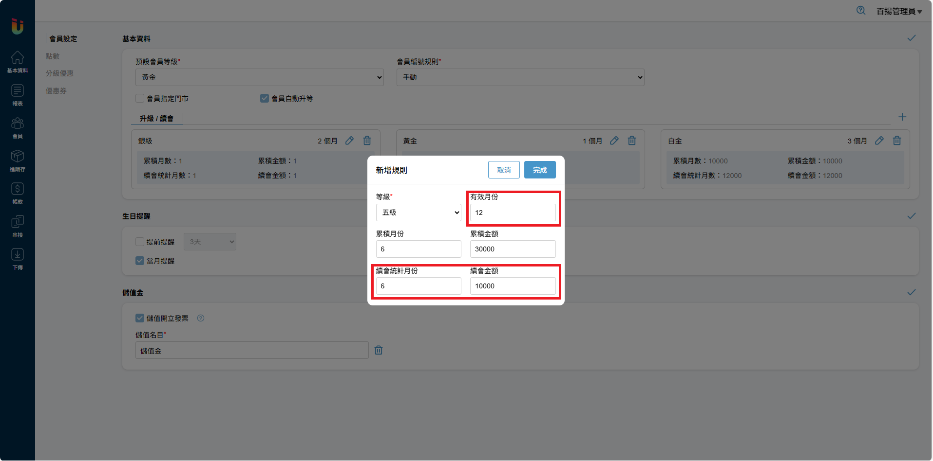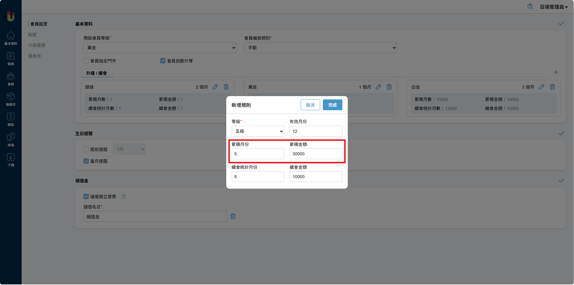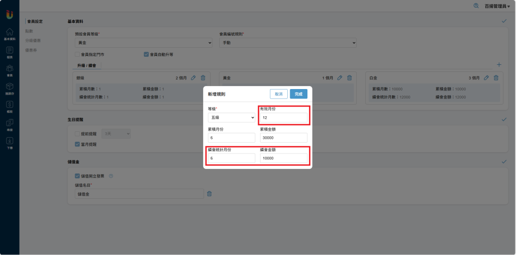 舉例:五級會員,累積月份 [6個月] 累積金額 [30000元],即為6個月內消費滿30000元即可從四級會員升級至五級會員。