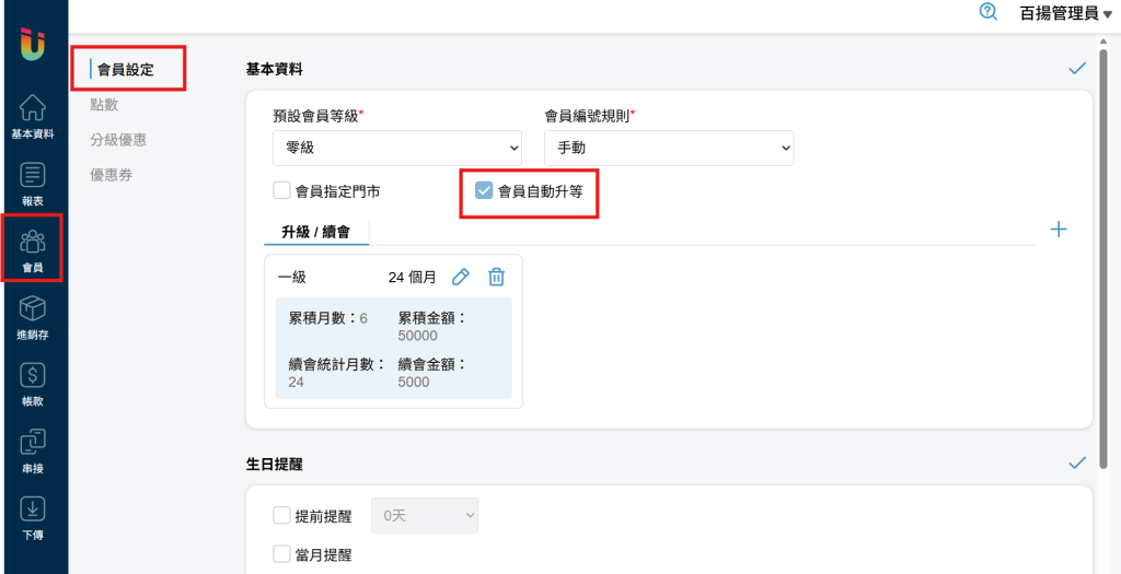 雲端後台左方列表點選 [會員] > [會員設定],並於該頁面的 [會員設定] 分頁處勾選 [會員自動升等] 即可開啟此功能。